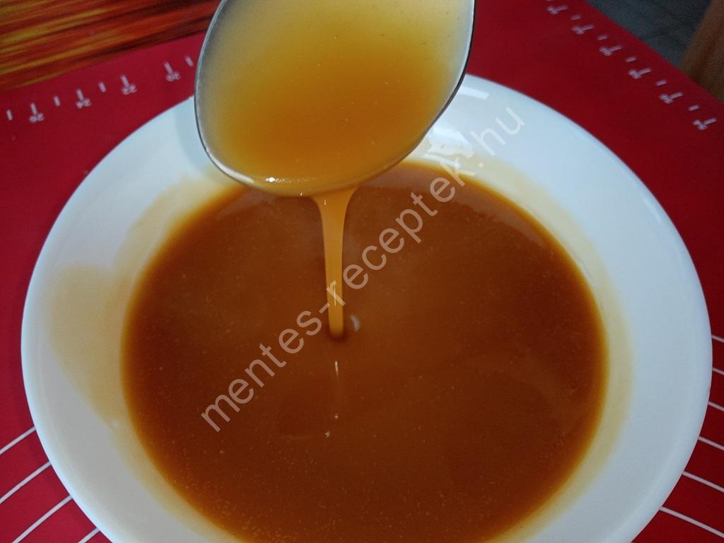 Egy magasabb falú edényben a cukrot kevergetve nagyjából felolvasztjuk. Vigyázzunk, hogy ne égjen meg, mert akkor keserű lesz.
