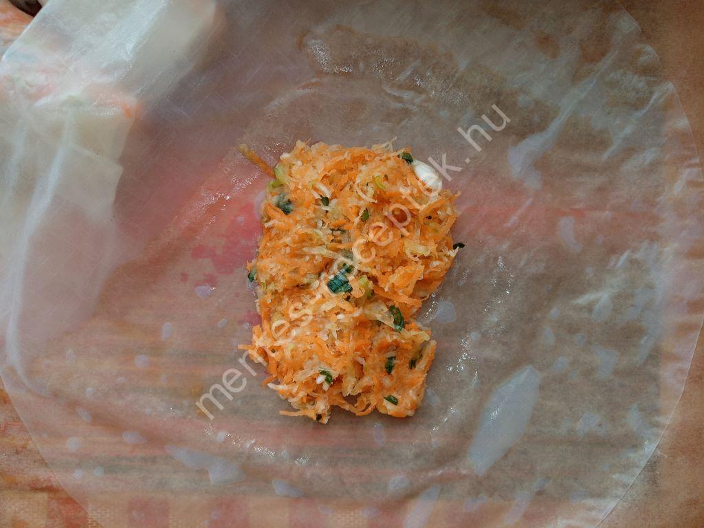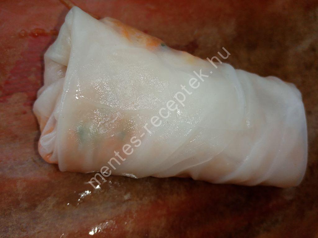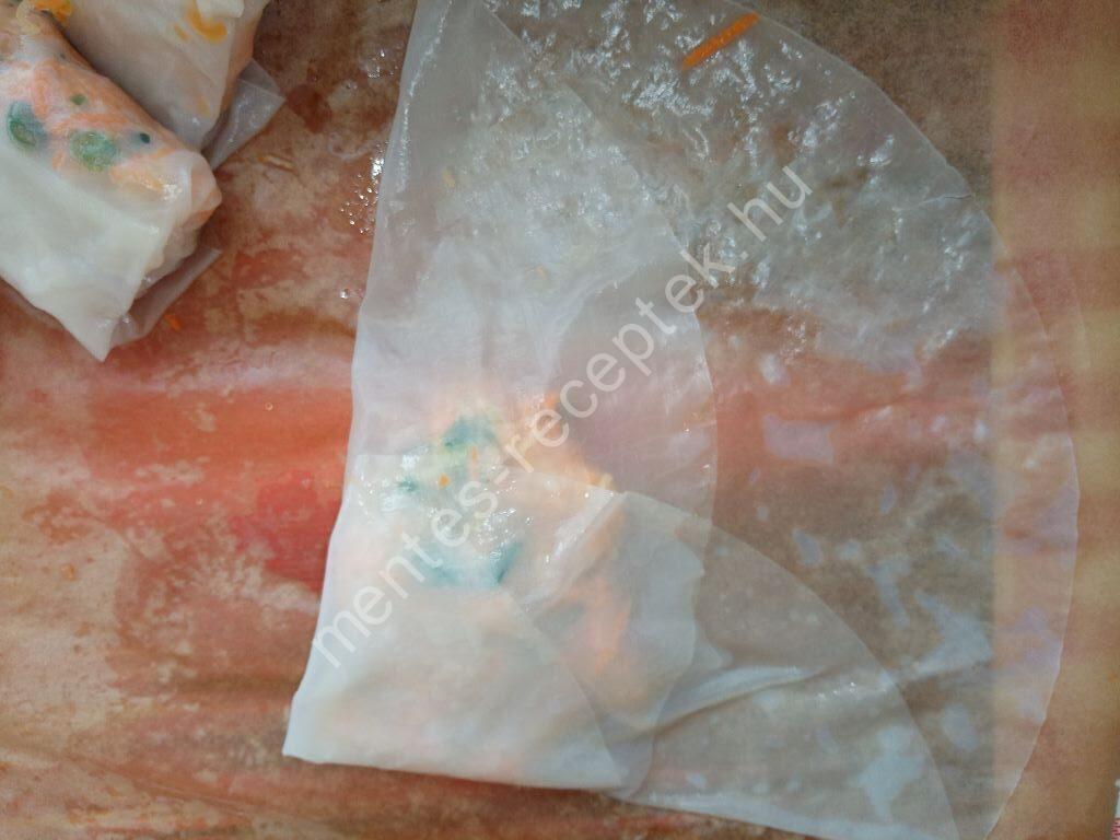 Langyos vízbe mártsuk a rizslapokat egyesével kb.20-30 másodpercre, majd terítsük egy szilikonlapra, sütőpapírra vagy nedves konyharuhára. A tölteléket osszuk 8 fele, majd arányosan helyezzünk belőle a közepére.