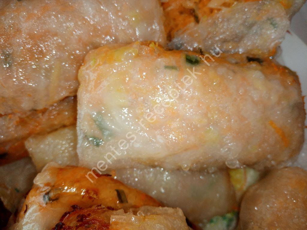 Magasfalú serpenyőben (pl. wok) melegítsünk olajat. Bő forró olajban süssük a tekercseket aranybarnára. Papírtörlővel bélelt tányérra szedjük ki, hogy lecsepegtessük róluk a felesleges olajat.